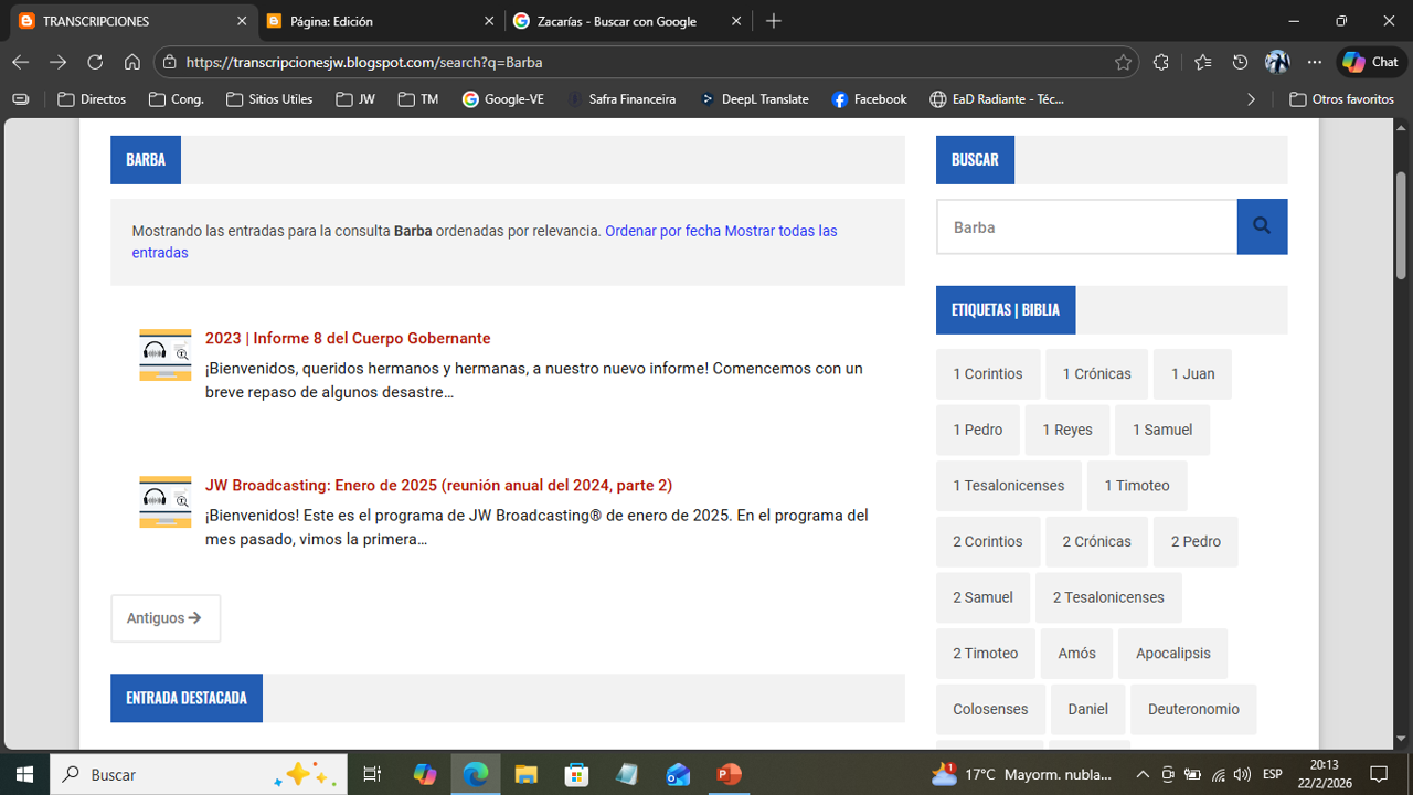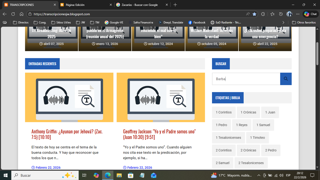 Siempre vas a usar https://transcripcionesjw.blogspot.com/search/label/ junto a las etiquetas que quieras buscar